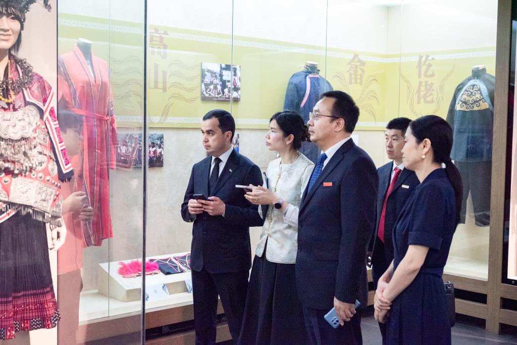 座谈会后,马玉堂陪同代表团一行参观走访了我校民族学博物馆和药学院。在民族学博物馆,代表团深入了解了中国各民族交往交流交融的历史。阿曼诺夫·亚历山大还现场体验互动电子翻书,“挥手”翻阅一文一物图文作品,查看馆藏文物3d展示细节。在参观药用植物标本馆和民族药学国家级实验教学示范中心时,代表团对展馆内展示的《黄帝内经》医书和学校研发的特色药品表示出了极大兴趣,不断询问相关细节。