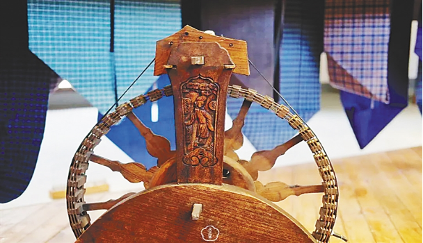 刻有黄道婆像的三锭木棉脚踏纺车。资料图