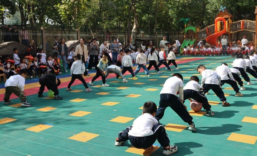 比赛首日,大班组的实力健将们在赛场跨越障碍物、滚动轮胎、原地跳绳、边走平衡木边滚动呼啦圈,在鼓舞和喝彩声中完成了“小小兵力量”“大显绳通”和“勇往直前”项目。镜头转到集体项目,“好运滚滚来”充满了呐喊与期待,小运动员们连成一线、默契配合,把好运之球传递给自己的队友。