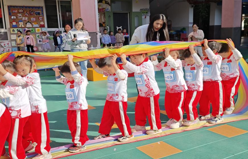 比赛次日,中班组得力干将踢蹴鞠、饰演袋鼠蹦跳、手持蒲扇扇动“小鸡”,代表班级完成了“一蹴即发”“袋鼠速度”和“给个鸡会”项目。在集体项目“无敌风火轮”中,孩子们齐心协力,快速冲向终点。