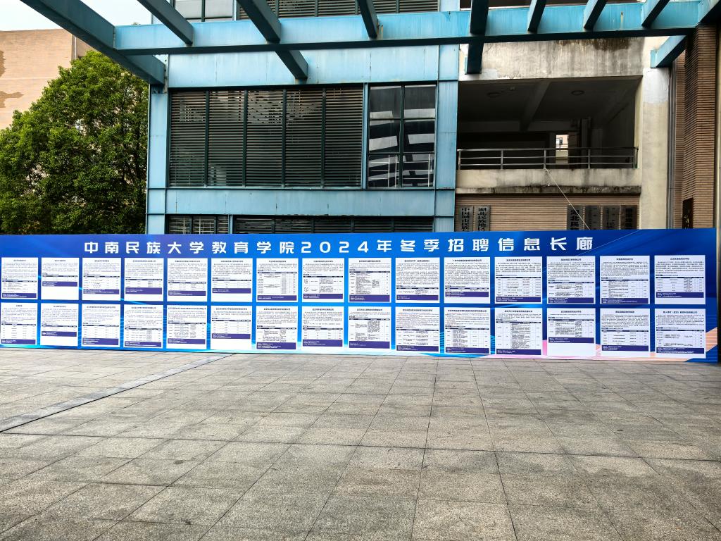 此外,为助力实现更对口、更高效的就业,教育学院在15栋教学楼下精心设立了2024年冬季招聘信息长廊。该长廊涵盖了以武汉地区为主并辐射周边城市的招聘信息,招聘单位类型广泛,既包含各类教育培训机构、科技传媒公司,亦涵盖各类学校。