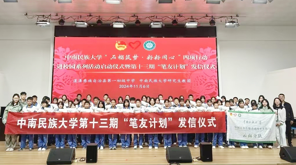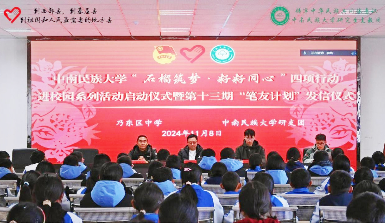四项行动即“共同书信”“共增好书”“共颂经典”“共绘画展”。在启动仪式上,4所服务学校300余名青少年共同观看了我校《石榴筑梦·籽籽同心》专题片,了解我校研究生支教团坚持以铸牢中华民族共同体意识为主线、促进民族团结进步事业的具体实践。西藏山南乃东区中学的藏族学生次珍说:“很高兴能够参加此次活动,希望通过此次活动和武汉的大哥哥、大姐姐们成为好朋友,一起成长进步。”