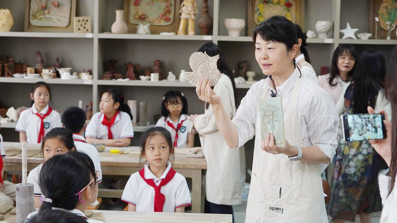 在陶艺实验室,美术学教研室主任郭红琳老师亲自演示揉泥、塑形、修饰等基础技法,手把手指导同学们掌握"搓、捏、揉、刻"的要领。大家围坐桌前,在美术学院大学生志愿者的协助下,小心翼翼地将一块块陶土转化为各种创意形象,形态各异的植物花卉、憨态可掬的卡通人物纷纷诞生。实验室里充满了专注的神情与欢快的笑声,同学们在实践中感受着陶艺的魅力。
