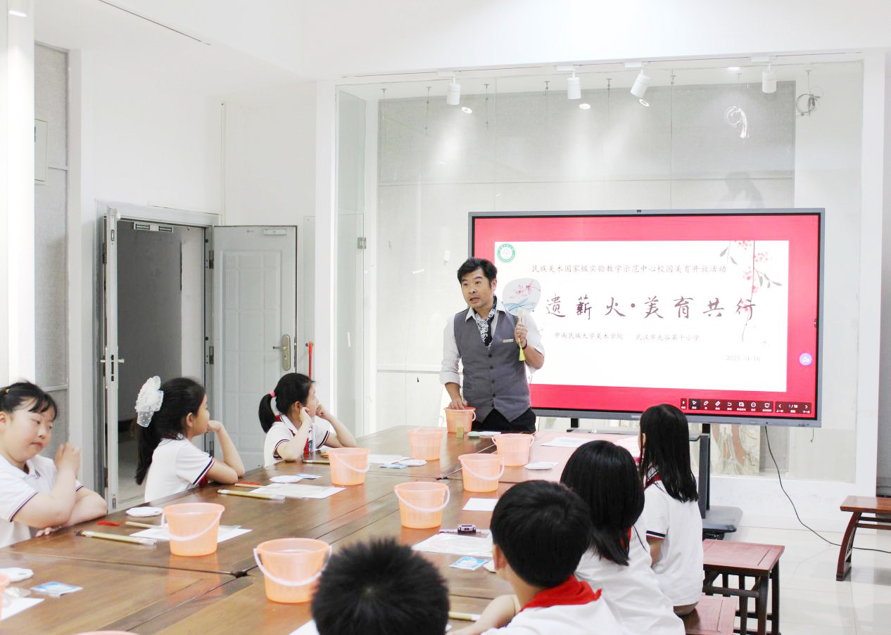 4月16日下午,美术学院举办“非遗薪火·美育共行”非遗美育进课堂活动,武汉市光谷第十小学四年级50余名小学生受邀走进民族美术国家级实验教学示范中心,在高校实验课堂上,近距离地体验了一场与传统非遗的美育对话。