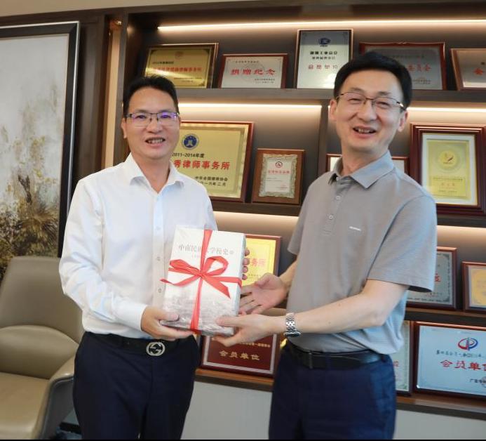 方校长对校企深度合作、人才培养机制改革等方面问题做了总结发言,希望加强与卓建律师事务所的合作,为学生提供更广阔的视野。方校长还将全册《中南民族大学校史》赠予唐扬新律师,希望全国校友们能够与学校携手共进、双向奔赴,共同抢占时代先机,共同在新征程中铸就新辉煌。
