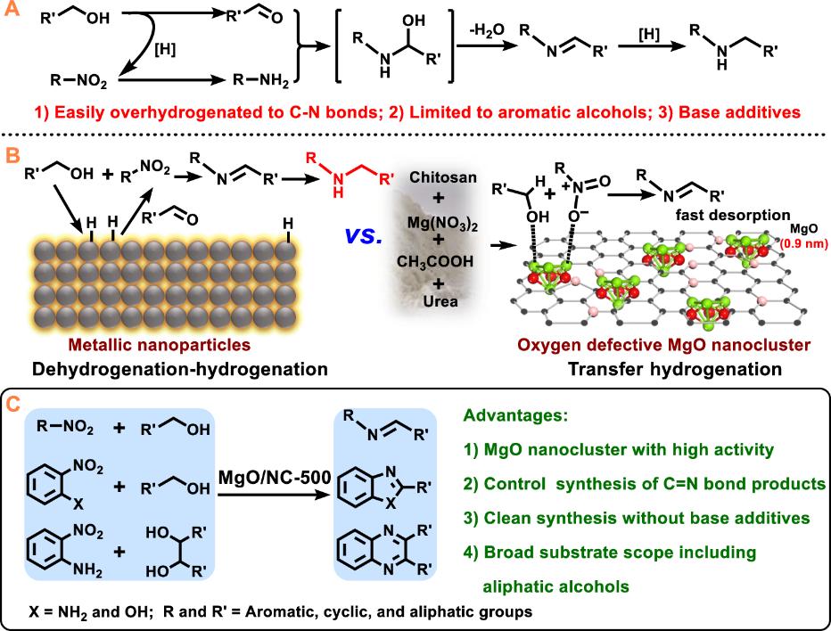不饱和c=n键的选择性构建在化学和生物学中非常重要,具有c=n键的有机含氮化合物,如亚胺和氮杂环化合物等广泛应用于精细化工、材料科学、药物研究、染料和颜料工业等领域。通常,c=n键的构建可以通过伯胺氧化(偶联)以及醛/酮与胺缩合实现。由于胺可由硝基化合物还原制得,而醛/酮可由醇氧化或脱氢获得,因此,采用硝基化合物和醇“一锅法”还原偶联直接构建c=n键可有效提高原子利用率,避免了多步反应及中间的纯化步骤,可简化工业生产工艺。但是,硝基化合物与醇还原偶联选择性构建不饱和c=n键极具挑战性,因为c=n键容易进一步还原为c-n键。此外,目前的方法多数局限于外加碱添加剂的活性芳香醇还原偶联。因此,合理设计新型催化体系,实现无添加剂条件下底物范围广泛的硝基化合物与醇的还原偶联制备含c=n键高值化学品具有重要的研究意义。张泽会教授课题组使用廉价的mg(no3)2、壳聚糖和尿素通过乙酸交联后简单热解的方法制备了氮掺杂碳材料负载mgo纳米团簇(mgo/nc-500)催化剂,能高效催化醇和硝基化合物还原偶联合成超过54个结构多样的亚胺、苯并唑和喹喔啉类有机含氮化学品,产率为86-99%。这项研究为设计地球上储量丰富且成本低廉的主族元素催化剂用于一些具有挑战性的有机转化提供了有价值的参考。